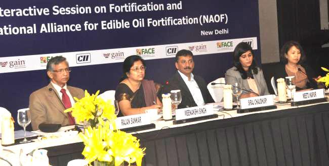 (L to R) : Mr. Lakshman Sethuraman Senior Manager, Tata Trust Mr. Salil Kumar Manager- India operations Global Alliance for Improved Nutrition Mr. Siraj Chaudhry Chairman National Alliance on Oil Fortification & Chairman, Cargill India Ltd. Ms. Meetu Kapur Executive Director, Confederation of Indian Industry Mr. Ashim Sanyal COO Voluntary Organization in the Interest of Consumer Education